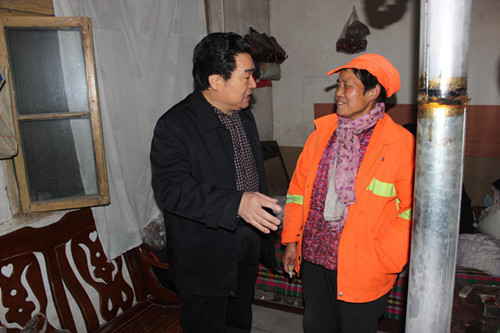 河南街小區(qū)保潔員王菊芹,家中子女常年在外與家里少有聯(lián)系,老伴又年老多病無法務工,還要撫養(yǎng)外孫上學,僅憑她做保潔的收入在河南街村租住了一間不及12平米的小屋作為三人的居所。趙明海首先感謝了她對公司默默作出的貢獻,鼓勵她說:“困難都是暫時的,要相信在城投集團的正確領(lǐng)導下,我們物業(yè)公司會越來越好,只要努力工作,公司會想方設(shè)法為職工解決困難!蓖瑫r要求工會和團支部要積極與上級溝通,取得支持,切實為困難職工辦實事,辦好事。王菊芹對公司領(lǐng)導在春節(jié)前夕前來看望慰問,激動地緊緊握住公司領(lǐng)導的手連聲表示感謝。
